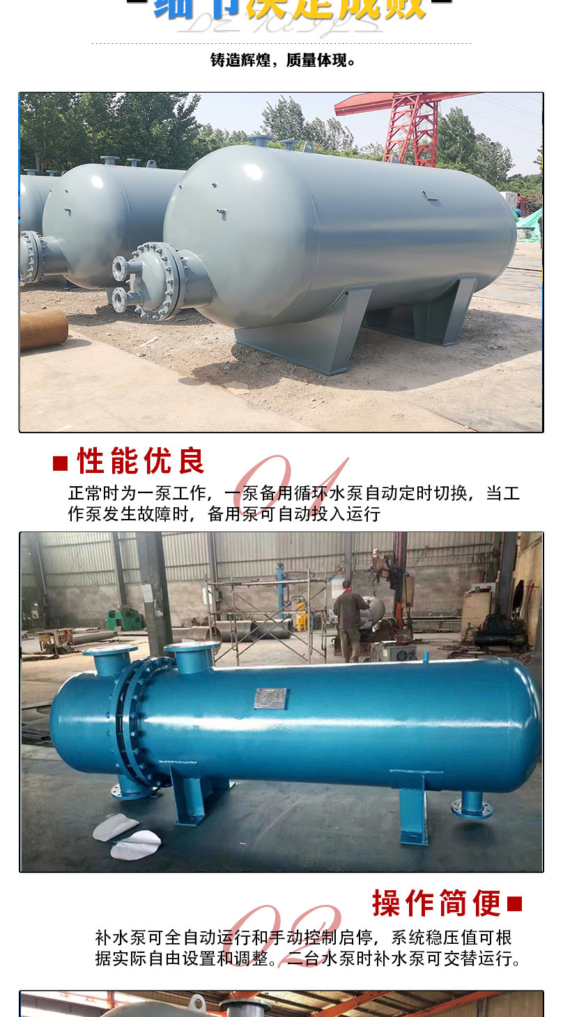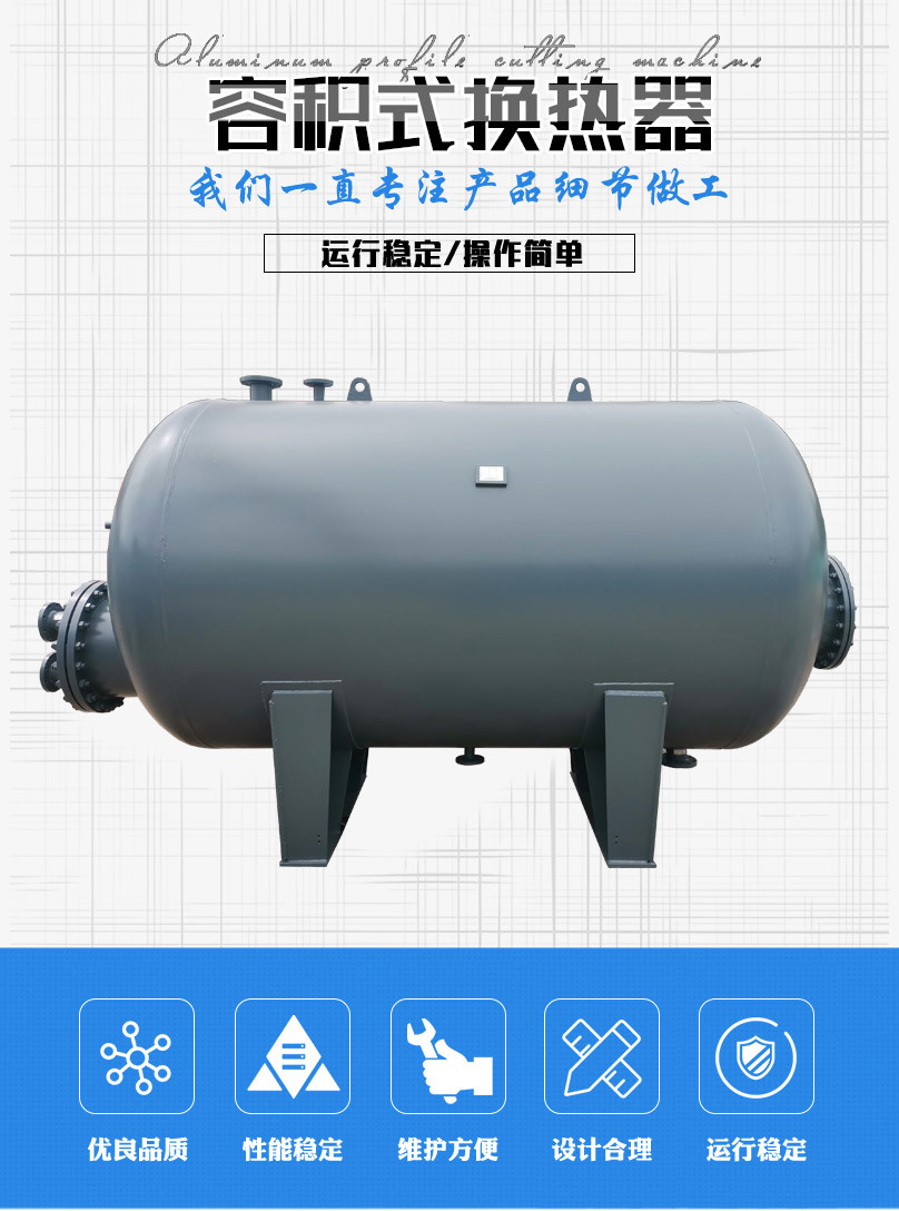 2、容積式換熱器換熱效果好,散熱效果好,散熱損失小,節(jié)能。同時(shí),以蒸汽為熱媒時(shí),能回收約占整個(gè)換熱量的15%凝結(jié)水熱量。