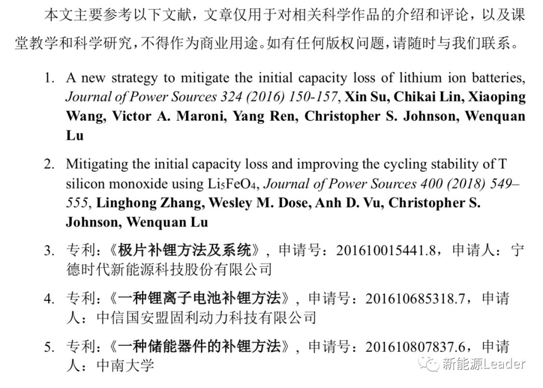 在Wenquan Lu推出Li5FeO4材料實現(xiàn)正極補鋰后,國內(nèi)廠家和研究機構(gòu)也對正極補鋰技術(shù)進行了迅速的跟進,并申請了大量的專利,例如安普瑞斯(無錫)、深圳比克等公司在2017年都申請了通過向正極中添加少量含Li的氧化物等材料,在首次充電過程中這些化合物能夠脫出Li+,補充負極在首次嵌Li和SEI膜形成過程中所消耗的Li,從而提升首次效率和電池比能量。